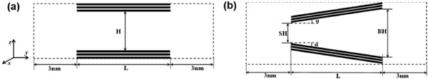 狹縫孔由半有限狹縫孔由兩個平行的石墨壁組成。每個壁包含三個石墨烯層,如圖1(a)所示。框的虛線表示模擬框在y和z方向上的邊界。周期性邊界條件僅適用于x方向。兩個開口端與大塊氣藏相連,每個氣藏沿y軸的長度為3nm,孔隙寬度決定了z方向的尺寸。因此,通過孔內(nèi)分子與體相的相互作用,可以在孔和周圍環(huán)境之間保持機械平衡。孔徑H是指通過一個壁最內(nèi)層中碳原子中心的平面與相對壁的相應(yīng)平面之間的距離。楔形孔在圖1(b)描繪了一個開放的楔形孔及其結(jié)構(gòu)參數(shù):小端(SH)和大端(BH)的孔徑,軸向孔長(L)和半角(α)?虻奶摼表示模擬框在y和z方向上的邊界。與狹縫孔一樣,開口端周圍的氣體沿y軸的長度為3nm,大端的寬度決定了z方向的尺寸。沿軸向(即,y方向)的孔長度是有限的L,而在x方向上的尺寸在應(yīng)用周期性邊界條件的情況下假定為無限。