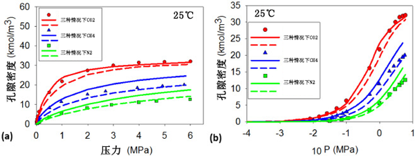 圖2:純氣體N2、CH4和CO2在T=25℃時在活性炭上的實驗數(shù)據(jù)。用狹縫和楔形孔中的吸附等溫線預(yù)測數(shù)據(jù):(a)絕對壓力和(b)對數(shù)標(biāo)度的絕對壓力。