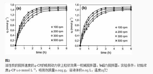 可以看出,吸附速率受攪拌速度的影響很大 - 吸附速率隨攪拌速度顯著增加。隨著攪拌速率從100rpm增加到500rpm,k 2值分別從0.577增加到1.264g mmol -1 h -1(機械攪拌器)和0.560-1.231g mmol -1 h -1(磁力攪拌器)。在相同的攪拌速度下,機械攪拌器和磁力攪拌器之間的差異沒有統(tǒng)計學意義(p > 0.05)。隨著攪拌速度的提高,4-CP分子從大塊液體向活性炭顆粒周圍的液體邊界層擴散的速率變得更高,這是因為紊流的增強和液體厚度的減小邊界層。隨著攪拌速度的增加,吸附劑顆粒破碎的程度增加,這種效果可能會進一步增強。在這些研究中,試驗前和試驗后的吸附劑的顆粒大小沒有測定,但在4-CP的吸附動力學的活性炭的粒子大小的影響是有據(jù)可查的。還描述了攪拌速度吸附率的增加為堿性染料的吸附上活性白土[ 6 ]以及乙酸,吡蟲啉和4-氯苯酚在活性炭上。