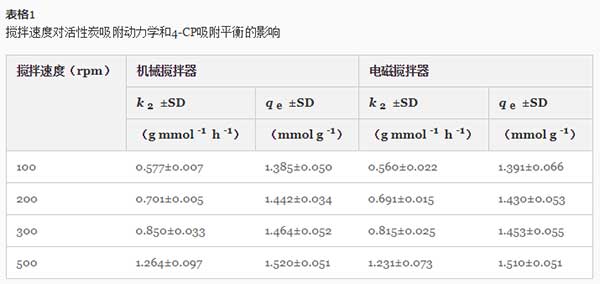 表1中的數(shù)據(jù) 也表明,攪拌速率不僅影響吸附動力學,而且影響4-CP從水中的去除效率。吸附容量從1.385增加到1.520 mmol·g -1(機械攪拌器)和從1.391增加到1.510 mmol·g -1(磁力攪拌器),攪拌速度從100增加到500rpm。觀察到從20.06 4-CP的吸附容量的增加至23.04毫克克-1攪拌速度從300到600轉(zhuǎn)。然而,一些作者已報道,用增加攪拌速度只能達到一定的限度,超過此有在吸附容量無顯著增加吸附增加。在一些情況下,觀察到在更高的攪拌速率在吸附容量的降低。正如作者所提出的,這是由于這樣一個事實,即在非常高的攪拌速度下,吸附分子和吸附劑顆粒的動能增加到足以使它們相互碰撞而導致分離松散結(jié)合的吸附分子。