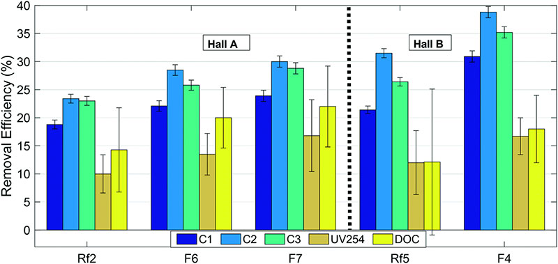 圖2:改造后的(F6,F(xiàn)7和F4)和參考(Rf2和Rf5)過濾器中活性炭對(duì)有機(jī)物級(jí)分的去除效率。誤差棒表示通過誤差傳播計(jì)算的標(biāo)準(zhǔn)誤差(N=4)。