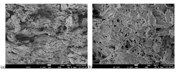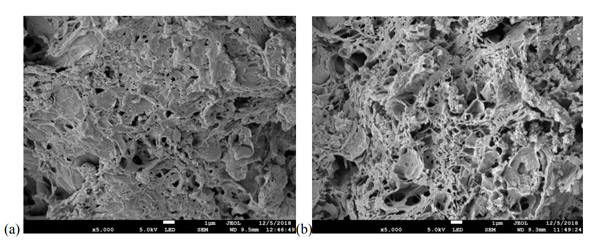根據(jù)觀察到的活性炭微觀結(jié)構(gòu)來(lái)進(jìn)行形態(tài)研究。圖1顯示了在650°C(a)和850°C(b)兩種不同溫度下用25%H3PO4制成的活性炭的比較。可以看出,與650℃相比,在850℃下制備的活性炭具有稍大的孔?梢缘弥左w積隨著活化溫度的升高而逐漸增加。