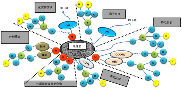 通常,磷的吸附過程是活性炭中的吸熱反應。等溫線包括Freundlich,Langmuir和Langmuir-Freundlich能夠預測廢水中活性炭對磷的吸附。在這些條件下,Langmuir通常更適合實驗數(shù)據(jù)。圖2總結了磷在活性炭表面上吸附的各種機理。一些機制以高親和力和強度(例如,配體交換和內球雙齒)將磷固定在其表面上,而另一些機制以較低的強度(例如,外球絡合和靜電吸引)固定在磷表面,從而降低了除磷效率。