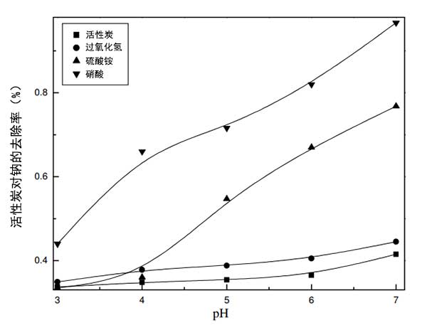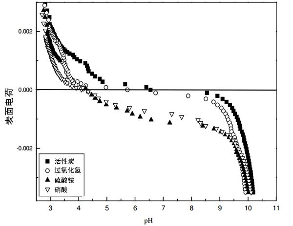 選擇用于改性活性炭表面的試劑都是氧化劑,目的是增加表面官能團的密度。從改性活性炭的化學表征結果可以看出,該任務成功實現(xiàn)。從圖1中可以看出,從活性炭和幾種氧化的活性炭動的酸度以相同的順序增加。酸度增加是由于存在羧基,酚類等酸性基團。