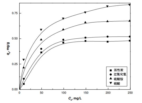 用活性炭和改性活性炭進行平衡吸附實驗,以評估它們使用合成的鎳廢水從水性介質(zhì)中除去二價鎳的能力。通過用0.1g活性炭與50mL濃度范圍為10mg/L至250mg/L的Ni(II)溶液平衡進行實驗,結果顯示在圖2中;钚蕴康拿靠宋饺萘恐蛋匆韵马樞蛟黾樱夯钚蕴>過氧化氫>硫酸銨>濃硝酸。氧化活性炭的容量增加是由于存在大量酸性基團,其可以與水溶液中存在的陽離子鎳交換它們的質(zhì)子。