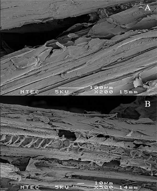 如圖3所示,將通過分離獲得的固相微結(jié)構(gòu)通過SEM與天然RH進行了比較。活性炭原材料提供了正常且完整的表面,表明植物材料的高度有序的完整結(jié)構(gòu)(圖3A)。分離的固體殘余物的生物質(zhì)的表面結(jié)構(gòu)顯示出表面和內(nèi)部結(jié)構(gòu)的破壞,并具有空腔和裂紋。該觀察結(jié)果表明半纖維素的去除和表面木質(zhì)素的改變。對于BET表面積測量,分析了原始和預(yù)處理的生物量樣品。