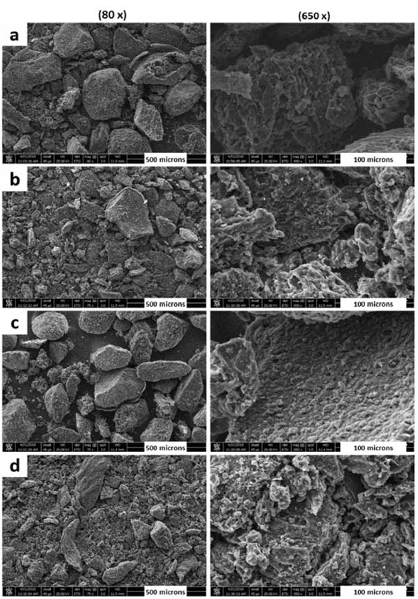 我們使用現(xiàn)代分析技術(shù)來了解制備的活性炭催化劑的真實性質(zhì),掃描電子顯微鏡(SEM)是查看材料形態(tài)的強大工具。圖1顯示了四種活性炭樣品的SEM圖像。圖像是在兩個不同的分辨率,以比較不同比例的樣本。評估不同煅燒溫度的影響是很重要的。圖1的左側(cè)圖像顯示,無論煅燒溫度如何,所有樣品的表面都被各種亞微米大小的顆粒所掩蓋,并且表面上存在許多明顯的解理。不同煅燒溫度下的熱解對活性炭樣品的形貌影響不大,但有輕微的變化,如一些顆粒從表面被去除,一些解理被侵蝕。此外,從這些SEM圖像可以推斷,這些活性炭材料中的許多微孔結(jié)構(gòu)使其成為任何化學(xué)反應(yīng)中反應(yīng)物相互作用的極好載體。