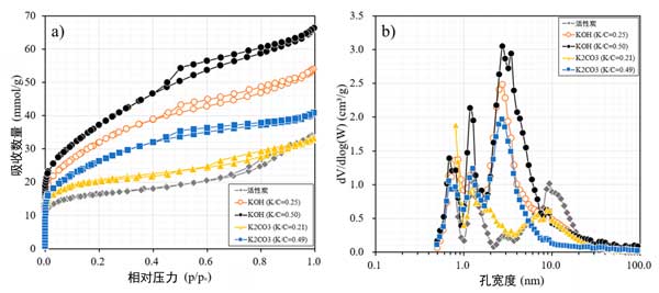 圖2:(a)氮等溫線和(b)通過用氫氧化鉀和碳酸鉀以不同鉀/炭比浸漬制備的活性炭的孔徑分布。