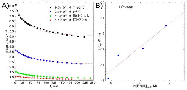 很明顯,銠溴化物絡(luò)離子的初始濃度將影響它們在電解質(zhì)中的平衡濃度和吸附過程的速率。這是圖2A,其中繪制了在T=50℃下在攪拌溶液中獲得的動力學(xué)曲線,攪拌速率為1200rpm。得到離子之間的線性相關(guān)性,確定系數(shù)接近圖2B。擬合線的斜率等于1.48±0.33,證實了初始假設(shè),即關(guān)于銠溴化物絡(luò)離子初始濃度的反應(yīng)的第一級。吸附動力學(xué)還應(yīng)取決于活性炭的表面積,前提是系統(tǒng)不受擴散控制。這已針對不同濃度的吸附劑進行了驗證。