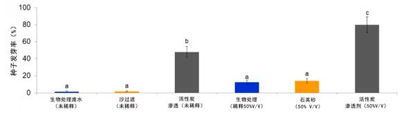 圖3:經(jīng)生物處理的含殺菌劑流出物(未稀釋或稀釋50%)在通過砂濾器和活性炭吸附柱系統(tǒng)處理前后的發(fā)芽指數(shù)(GI)值。由相同字母指定的條形在5%的水平上沒有統(tǒng)計差異。