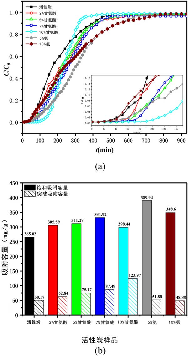 測(cè)試了選定的甲苯VOC對(duì)活性炭的吸附性能。在每個(gè)實(shí)驗(yàn)運(yùn)行中,甲苯通過(guò)裝有活性炭的吸附管直到達(dá)到平衡,即活性炭吸附劑被甲苯飽和。圖2(a)所示的穿透曲線(xiàn)呈現(xiàn)為甲苯吸附量吸附(ç/ç0)與接觸時(shí)間(噸,分鐘)六種的活性炭正在進(jìn)行中,它們的飽和和突破吸附容量如圖2所示(b)。從吸附曲線(xiàn)可以看出,甘氨酸修飾的活性炭的穿透時(shí)間明顯延長(zhǎng),而飽和氨改性活性炭的時(shí)間延長(zhǎng);钚蕴可霞妆酱┩肝侥芰Φ捻樞?yàn)?0%甘氨酸改性活性炭>7%>5%>2%>5%氨改性活性炭>未改性活性炭>10%氨改性活性炭,而活性炭對(duì)甲苯飽和吸附容量的順序如下:5%氨改性>10%>7%甘氨酸改性>5%>2%>10%>未改性活性炭?梢(jiàn)甘氨酸修飾對(duì)甲苯吸附有顯著的正向影響。與原來(lái)的AC相比,甘氨酸改性的活性炭對(duì)甲苯的突破吸附能力分別提高了25%、50%、74%和147%,隨著甘氨酸濃度的增加呈上升趨勢(shì)。同時(shí),甘氨酸改性的活性炭對(duì)甲苯的飽和吸附容量分別增加了15%、17%、25%和13%,且隨著甘氨酸濃度的增加先增加后減少。5%和10%的氨改性也提高了甲苯的吸附性能,但其優(yōu)勢(shì)主要體現(xiàn)在飽和吸附容量上,與原來(lái)的活性炭相比,分別提高了47%和32%。