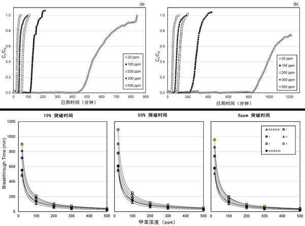 圖2:(a)活性炭濾芯1和(b)6小柱類型的突破曲線(按甲苯濃度),穿透時間與不同小柱類型的甲苯濃度的函數(shù)關(guān)系。