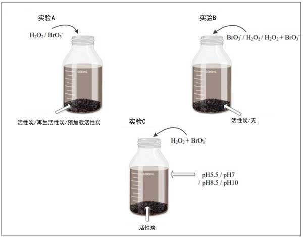 在對(duì)50家飲用水公用設(shè)施進(jìn)行的調(diào)查中,獲得過(guò)氧化氫和溴化物的平均值來(lái)當(dāng)做測(cè)試用水。在所有實(shí)驗(yàn)中,批量反應(yīng)器都用薄箔包裹。制備0.052µmol/L溴酸鈉溶液并加入間歇反應(yīng)器中以獲得0.5µmol/L溴酸鹽的濃度。高級(jí)氧化工藝中的出水殘留過(guò)氧化氫濃度不會(huì)超過(guò)180µmol/L。因此,在本研究中,將150µmol/過(guò)氧化氫加入到間歇式反應(yīng)器中。如圖1所示,在23–27℃的環(huán)境溫度下,使用36個(gè)批次玻璃瓶進(jìn)行了一系列實(shí)驗(yàn);钚蕴坑昧渴冀K為5g/L,過(guò)氧化氫和溴酸鹽濃度始終分別為150µmol/L和0.5µmol/L。所有裝有過(guò)氧化氫的間歇式反應(yīng)器都用鋁箔覆蓋,以防止過(guò)氧化氫被光潛在降解。在如圖1所示的實(shí)驗(yàn)中,使用16個(gè)間歇式反應(yīng)器和三種不同的活性炭(活性炭、再生活性炭和預(yù)加載活性炭)來(lái)研究不同運(yùn)行時(shí)間的活性炭對(duì)溴酸鹽和過(guò)氧化氫的去除,該實(shí)驗(yàn)涉及八個(gè)處理組。