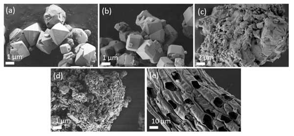 圖1:所選吸附劑的SEM(a)混合沸石、(b)沸石、(c)凝灰?guī)r、(d)活性炭、(e)泥炭。