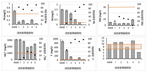 圖2:活性炭等吸附劑的篩選。廢水中污染物的數(shù)量顯示在主y軸上的列中,污染物減少量顯示為次要y軸上的黑點(diǎn)。橙色線是水道排放的限值。