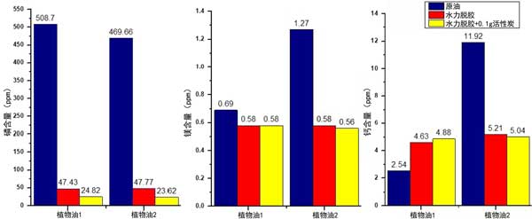 磷含量在兩個兩種植物油中主要由以所示的處理(水重量2%+活性炭0.1克)后減少圖2。植物油1的磷含量降低了大約95.22%,而植物油2的磷含量降低了大約相同的值(94.98%)。油液經水脫膠后Mg、Ca含量略有下降,而Ca處理后略有升高。這一結果可能是由于在處理過程中活性炭中存在一些Ca解離回油相。活性炭對磷含量的大量降低是由于NaOH改性的活性炭具有極性、帶正電荷的表面。由于存在芳環(huán)簇和固有缺陷,它還具有磁力。在脫膠過程中將活性炭添加到植物油和水中時,活性炭的芳環(huán)簇中的離域電子產生磁矩,強烈誘導磷脂磷酸頭部周圍的順磁性氧。同時,活性炭的極性/親水性也允許與極性水分子相互作用。水分子也被磁場激活,從而發(fā)生氫自旋從旁水到鄰水的重新定向,從而降低水的抗磁性;钚蕴空T導的這種磁場會導致表面張力降低,削弱水分子的分子內能。結果,更多的水分子被分解成H+離子和OH-離子,促進更多水解反應。這些現象與其他力量相結合:熱能和離心也會引發(fā)磷脂分子內的鍵斷裂,導致磷酸頭部基團從磷脂分子上分離(脫磷脂)。