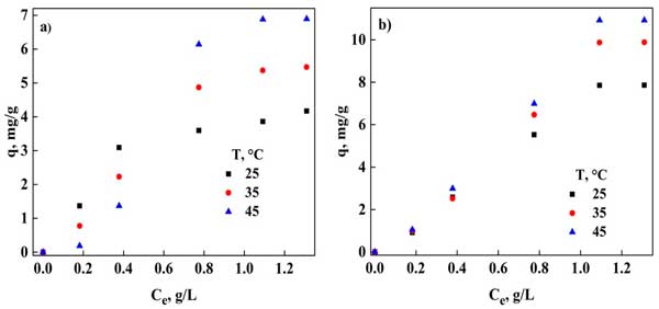 平衡吸附分析使我們能夠獲得不同等溫線模型的參數(shù),表明在去除污染物時進行了何種類型的過程。在圖1中,顯示了使用粉末活性炭(圖1a)和活性炭(圖1b)在不同溫度下DNS的吸附能力。還觀察到3,5-二硝基水楊酸在兩種吸附劑中的吸附都隨著溫度的升高而顯著影響,隨著溫度的升高呈現(xiàn)出更大的吸附。因此,在45℃時,活性炭和粉末活性炭的大吸附容量分別為6.97和11.57mg/g。這可能是由于去除過程的環(huán)境,這會導(dǎo)致吸附劑表面隨著溫度的升高而增加其對3,5-二硝基水楊酸吸附的參與。使用商用活性炭的文獻中也報道了類似的行為。在其他研究中,使用這種吸附劑還觀察到,基于苯酚、高氯酸鹽和重金屬等的不同化合物的吸附能力有所增加。
