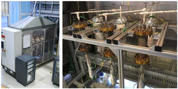 圖1:實(shí)驗(yàn)室規(guī)模的甲烷化試驗(yàn)臺(tái)(左),反應(yīng)器和熱交換器(右)。