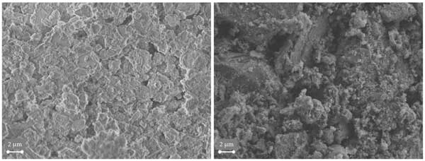 圖2:新(左)和舊(右)塊狀催化劑球的SEM圖片。