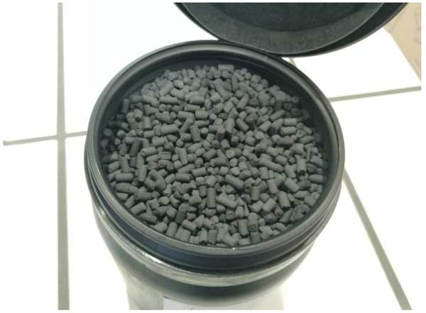 根據(jù)直接使用瓶裝真實(shí)氣體所獲得的結(jié)果,包括列出的催化劑毒物,這會(huì)導(dǎo)致催化劑快速降解,因此在第一個(gè)反應(yīng)器的上游安裝了活性炭過濾器。為此,將金屬氧化物浸漬的活性炭顆粒添加到氣體混合站。這些顆粒專門開發(fā)用于從缺氧氣流(例如CO2、N2、CO和H2)中去除硫化氫、有機(jī)硫醇、二氧化硫、硫化羰和氮氧化物。它們的銅含量為7%(以CuO計(jì)),直徑為3mm,長度為7mm(圖3)。將總共約300毫升的這些顆;钚蕴考尤霘怏w混合站。
