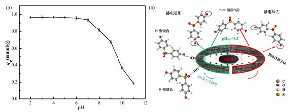 圖4:(a)pH值對活性炭吸附雙酚S容量的影響,(b)雙酚S在活性炭上的吸附機(jī)制。