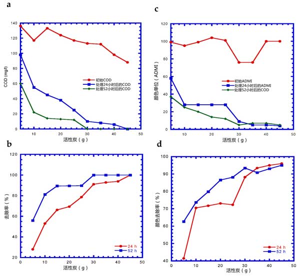 不同活性炭用量在24和54小時(shí)后COD和ADMI的變化如圖2所示。在初始COD濃度為88-136mg/L的情況下,分別通過吸附染料廢水24和52小時(shí)來完全去除COD需要45和30g的活性炭用量(圖2ab)。ADMI的降低和去除趨勢(shì)隨活性炭用量24和52小時(shí)的變化與COD變化相似(圖2)。ADMI隨著活性炭用量的增加而降低;钚蕴课24小時(shí)和52小時(shí)后,殘留ADMI分別為4-5和5-7。隨著活性炭用量≥30g,ADMI的去除效率從88-96%提高到90-95%。