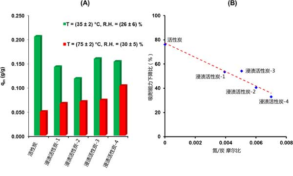 甲基碘吸附容量的降低程度取決于活性炭的性質(zhì)(圖2(A))。正如預(yù)期的那樣,對于未浸漬的吸附劑觀察到有害的影響,其中僅已知不涉及CH3I吸附的特定相互作用。更準(zhǔn)確地說,當(dāng)從活性炭材料的第一組條件轉(zhuǎn)移到第二組條件時,概述了大約76%的吸附容量下降(圖2)。在這方面,為了克服與水蒸氣和溫度相關(guān)的影響,三乙二胺浸漬是必不可少的。最近,由于水對三乙二胺分子具有很強(qiáng)的親和力,因此三乙二胺浸漬可以通過釋放載體的活性位點來提高活性炭的保留性能]。此外,與其他機(jī)制(尤其是物理吸附)相比,化學(xué)吸附甲基碘的比例隨著溫度升高而增加。然后,三乙二胺與甲基碘的化學(xué)反應(yīng)性將在較高溫度下增強(qiáng)。得到的結(jié)果(圖2)表明隨著氮含量的增加,在“惡劣條件”下的保留性能逐漸提高。因此,以浸漬中含量最高為特征的活性炭-4吸附劑的吸附容量僅降低了33%。更準(zhǔn)確地說,可以推斷出所有考慮的吸附劑的減少幅度和摩爾比之間的準(zhǔn)線性關(guān)系(圖2B)。根據(jù)這種關(guān)系,似乎需要浸漬,以確保在更嚴(yán)格的條件下更牢固地固定甲基碘。