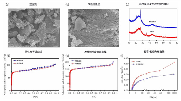 當(dāng)原活性炭經(jīng)受0.1mol/L、0.5mol/L和0.8mol/L高錳酸鹽,煅燒溫度為400℃、500℃、800℃,煅燒時(shí)間為2小時(shí),5小時(shí)和7小時(shí)。通過三因素三水平正交試驗(yàn)和極差分析篩選出改性活性炭的合適組合。改性后觀察到活性炭表面形態(tài)發(fā)生顯著變化,分別如圖1(b)所示。改性前的活性炭表面有較大的團(tuán)聚顆粒,表面沒有明顯的孔隙結(jié)構(gòu)。改性后表面粗糙,呈不規(guī)則凸起的刺狀顆粒結(jié)構(gòu),孔隙結(jié)構(gòu)發(fā)達(dá)。改性前后活性炭的XRD圖如圖1(c)所示。活性炭改性前后的峰形相似,但一些峰出現(xiàn),另一些峰消失。圖1(d)和1(e)分別顯示了活性炭改性前后的吸附和解吸等溫線。它們整體呈隨P/P0增加的趨勢,吸附量增加,但在相同情況下,改性活性炭的吸附能力更強(qiáng)。圖1(f)為改性前后活性炭的孔容孔徑分布,改性后的活性炭孔體積更大。改性活性炭的比表面積是活性炭的兩倍,累積吸附總孔體積是活性炭的1.72倍。