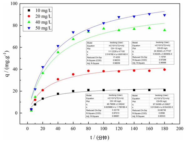 根據(jù)動(dòng)力學(xué)方程,當(dāng)溫度為25℃且改性活性炭用量為8g/L時(shí),擬一級(jí)動(dòng)力學(xué)和擬二級(jí)動(dòng)力學(xué)分別用于擬合。發(fā)現(xiàn)二階動(dòng)力學(xué)方程的擬合效果更好,結(jié)果如所示圖2。