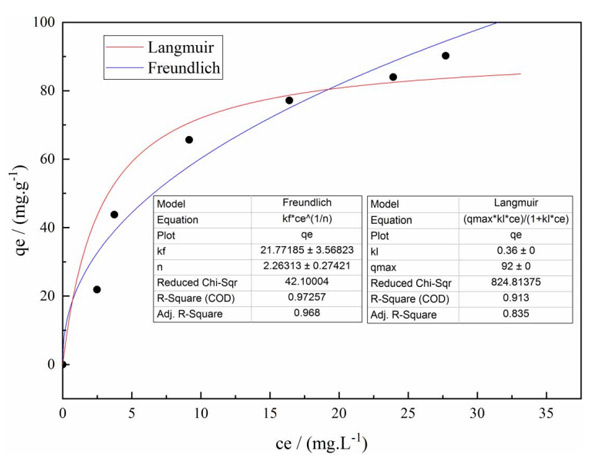 當(dāng)反應(yīng)溫度為25℃,投加量為8g/L時(shí),可獲得不同初始濃度下亞硝基二乙胺的平衡濃度和改性活性炭的平衡吸附容量。使用Langmuir和Freundlich熱力學(xué)方程對(duì)數(shù)據(jù)進(jìn)行擬合,結(jié)果如所示圖3從圖中可以看出,吸附過程不符合Langmuir等溫線方程,F(xiàn)reundlich吸附等溫線方程也適用。當(dāng)初始濃度達(dá)到一定值時(shí),吸附趨于平衡并達(dá)到飽和。