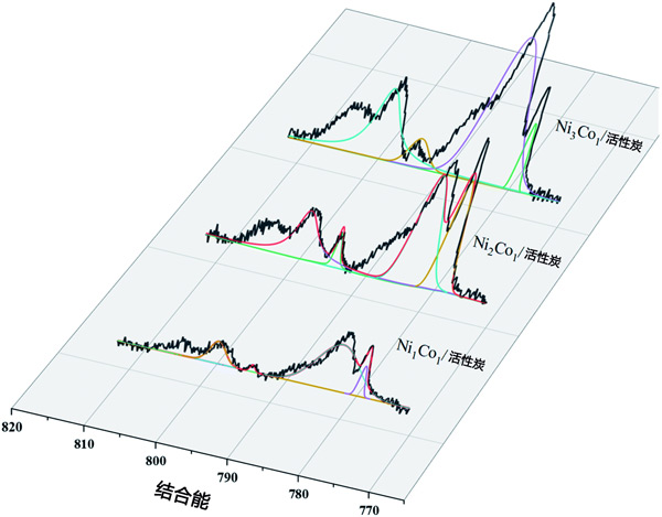 采用X射線光電子能譜(XPS)對多種活性炭催化劑進行表面分析,并對鎳和鈷進行表征氧化態(tài)。Ni02p光譜表現(xiàn)出兩個貢獻,2p1/2和2p3/2(由自旋軌道分裂產(chǎn)生),分別位于870eV和852.4eV(圖1a-d),可以分配給存在金屬鎳。O1s峰和Ni2+的存在,這可以通過在873.8eV(Ni2+2p1/2)和852.8eV(Ni2+2p3/2)的主峰上觀察到的肩峰來證明,表明樣品在暴露于大氣層。類似地,催化劑中Co2p的XPS光譜(圖2)顯示出四個主峰,結(jié)合能分別為778.45eV、782.7eV、793.66eV和798eV,對應(yīng)于Co02p3/2、Co2+2p3/2,Co02p1/2和Co2+2p1/2。此外,根據(jù)載鎳活性炭,已觀察到載鎳鈷活性炭的結(jié)合能偏移隨著鈷負(fù)載量的增加而增加,最大偏移約為0.3eV。在比較這些樣品時,從載鎳活性炭到載鎳鈷活性炭向更高結(jié)合能的轉(zhuǎn)變提供了鎳、鈷和載體物質(zhì)之間相互作用的證據(jù)。