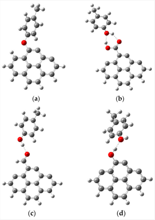 預(yù)計甲酚在活性炭上的吸附將通過各種類型的相互作用進(jìn)行,例如電子供體-受體機制、靜電相互作用、π-π相互作用和氫鍵形成。然而,在各種類型的相互作用中,活性炭和被吸附物之間的氫鍵是有助于吸附過程的重要相互作用類型之一。因此,在本研究中,使用DFT方法研究了對甲酚和活性炭之間的氫鍵相互作用。考慮到它們之間的氫鍵,研究了對甲酚與原始活性炭和功能化活性炭的相互作用。圖1代表各種相互作用的優(yōu)化結(jié)構(gòu)。