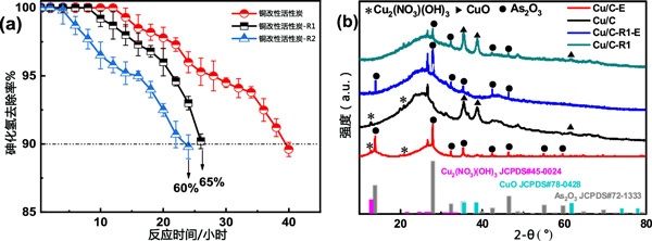 銅改性活性炭通過水洗和吹掃氣體法進行再生。為此,活性炭樣品首先在100℃的熱空氣中活化3小時。然后用去離子水浸泡清洗4-5次,放入電熱風(fēng)烘箱中110-120℃烘干。之后,將樣品置于氮氣氣氛下的管式爐中,并使用程序升溫控制器升高溫度?紤]到通過在180℃下烘烤獲得的材料,溫度首先設(shè)定在20-180℃。之后,停止加熱,將樣品冷卻至室溫。取出樣品,停止氮氣流,對再生材料進行測試。如圖3a所示,R的再生效率(R為再生吸附劑與新鮮吸附劑的穿透時間之比)在一個再生循環(huán)后為65%。在第二次再生循環(huán)后,樣品恢復(fù)效率R達(dá)到60%,證實了活性炭吸附劑對去除AsH3具有合理的再生能力。為了確定活性炭吸附劑再生后表面相的變化,通過XRD分析活性炭吸附劑。如圖3b所示,再生后活性炭-R1中35.6°、38.8°和61.8°的CuO衍射峰強度明顯增加,但沒有Cu2(NO3)峰被找到。這表明在再生過程中回收的一些CuO物種可能被中間體Cu2(NO3)(OH)3轉(zhuǎn)化。此外,活性炭-R1樣品中As2O3在28.0°、32.2°、35.5°、42.6°、46.4°、55.0°和59.6°處的結(jié)晶峰明顯減弱。推測中間體Cu2(NO3)(OH)3向吸附活性中心CuO的轉(zhuǎn)變和結(jié)晶As2O3的分離可能是活性炭吸附劑再生性能好的原因。
