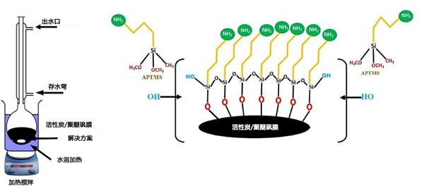為了改性活性炭的表面,將15g非常細的干燥活性炭粉末與300mL甲苯和2mL氨丙基三甲氧基硅烷(APTMS)溶液在磁力攪拌下在40℃惰性環(huán)境下混合24小時。圖1表示實驗裝置的示意圖。使用實驗室旋轉(zhuǎn)蒸發(fā)儀去除溶劑。用甲苯和丙酮進一步洗滌所得的APTMS活性炭,然后在60℃下真空干燥6小時。這種干燥的活性炭被稱為改性活性炭,由表面上的胺官能團組成。改性活性炭在干燥條件下儲存以用于后續(xù)的實驗工作。