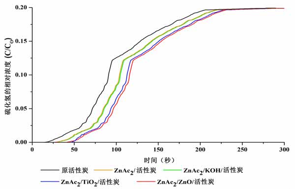 通過選擇合成吸附劑對硫化氫氣體的吸附效果產(chǎn)生了如圖3所示的吸附曲線。這些吸附曲線也與使用浸漬活性炭和原活性炭實現(xiàn)的吸附進行了比較。我們發(fā)現(xiàn)吸附趨勢呈指數(shù)增長,形成S曲線。突破時間被確定為硫化氫濃度達(dá)到1ppm(突破濃度)和飽和濃度達(dá)到幾乎5000ppm的值所用的時間。與其他雙金屬活性炭吸附劑相比,ZnAc2/ZnO/活性炭吸附劑的吸附表現(xiàn)出優(yōu)異的性能。雙金屬活性炭吸附劑的合成表現(xiàn)出良好的性能,與ZnAc2/活性炭和原活性炭相比,硫化氫的吸附增加了30.2-45.8%和85.9-89.1%。因此,采用這種浸漬方法的活性炭表現(xiàn)出的高吸附增強了硫化氫吸附能力。