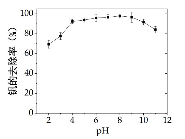 圖1:pH值對(duì)活性炭載納米零價(jià)鐵上釩的吸附。