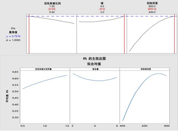圖2:研究變量對二苯并噻吩轉(zhuǎn)化率的影響,轉(zhuǎn)化率隨著活性炭催化劑用量和初始硫濃度的增加而增加,隨著Ni負載量的增加而降低(上圖)。對于活性炭催化劑用量、Ni負載量和初始硫濃度,在0.5g、6%和700ppm時,最佳二苯并噻吩轉(zhuǎn)化率分別為75.74%(下圖)。