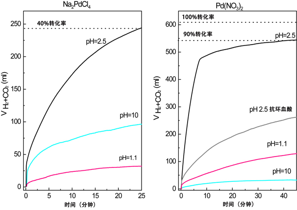 兩種不同的Pd前驅(qū)體在不同浸漬pH下制備的活性炭催化劑在60℃時(shí)產(chǎn)生的重整氣體(H2+CO2)的體積隨時(shí)間的變化曲線圖在圖2顯示。由于甲酸鈉添加劑對(duì)甲酸脫氫的促進(jìn)作用,催化測試在存在的情況下進(jìn)行]。所有制備的樣品都顯示出研究反應(yīng)的活性。正如在當(dāng)前測試條件下所預(yù)期的,曲線的形狀遵循甲酸中的一級(jí)動(dòng)力學(xué)。為了更好地理解析氫曲線,我們測量了不同階段的反應(yīng)pH值:分散催化劑和甲酸鈉在60℃攪拌30分鐘后,注入甲酸后,當(dāng)反應(yīng)開始時(shí)和使用Na2PdCl4制備的催化劑系列反應(yīng)25分鐘后和Pd(NO3)2系列反應(yīng)40分鐘后,根據(jù)圖7所示的曲線。表明在所有樣品的反應(yīng)過程中,甲酸+甲酸鈉緩沖液的初始pH值保持不變,除了使用Pd(NO3)2制備的樣品,在pH值2.5下浸漬并用銻還原。對(duì)于該樣品,反應(yīng)40分鐘后的pH值為8.2,表明緩沖條件的喪失和甲酸的總消耗量與實(shí)現(xiàn)的90%甲酸轉(zhuǎn)化率一致。對(duì)于該系列的其余部分,pH測量值表明甲酸并未完全消耗,這與實(shí)現(xiàn)的轉(zhuǎn)化率一致。