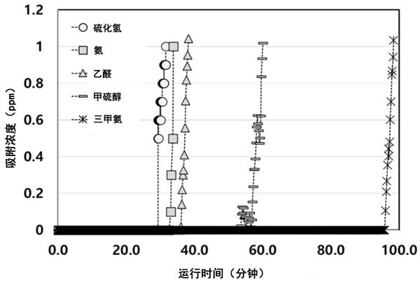 為了評(píng)估活性炭對(duì)不同廢氣的有效吸附量,應(yīng)研究其吸附能力。廢氣的氣味閾值和刺激水平在十億分之一的水平。吸附劑的總吸附容量很難用作從廢物中去除廢氣的設(shè)備的設(shè)計(jì)因素。因此,我們根據(jù)突破點(diǎn)計(jì)算了小于1ppm的有效吸附量。突破柱實(shí)驗(yàn)在304不銹鋼管式反應(yīng)器中進(jìn)行,總流量為1L/min,其中包含硫化氫(H2S)、氨(NH3)、乙醛(AA)、甲硫醇(MM)和三甲胺(TMA),如圖2所示。突破曲線依次為H2S、NH3、AA、MM、TMA。與廢氣相比,TMA具有更好的動(dòng)態(tài)吸附性能,因?yàn)樗哂懈L的突破時(shí)間和相應(yīng)的更大的有效吸附容量(<1ppm)。