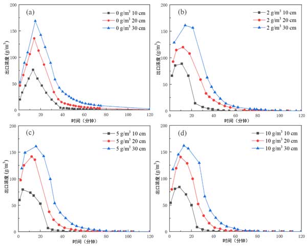 圖3:具有不同背景濃度的每個(gè)床出口的甲苯氣體出口濃度曲線(xiàn)。(a)0g/m3,(b)2g/m3,(c)5g/m3,(d)10g/m3。
