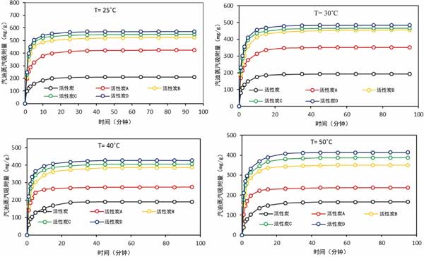 經(jīng)過進(jìn)一步研究,發(fā)現(xiàn)活性炭D樣品比其他樣品更能增強(qiáng)汽油蒸汽吸附,這表明表面結(jié)構(gòu)在捕獲分子方面的重要性和關(guān)鍵作用,正如預(yù)期的增強(qiáng)吸附一樣。事實(shí)上,與其他合成樣品相比,活性炭樣品具有更高的表面積和豐富的微介孔,可以顯著提高吸附量圖2。我們還研究了活性炭用量對(duì)吸附容量的影響。正如發(fā)現(xiàn)的那樣,隨著活性炭的用量增加,蒸汽吸附能力可以進(jìn)一步提高,這可能是由于通過提高活性炭量,表面積和孔隙反而增加,進(jìn)而可能有助于增強(qiáng)吸附。鑒于發(fā)現(xiàn)隨著活性炭用量比從1增加到4,汽油蒸氣吸附能力提高。