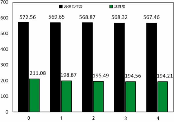 為了研究吸附劑吸收汽油蒸汽的性能,我們進(jìn)一步評(píng)估了樣品在吸附-解吸循環(huán)中的可重復(fù)使用性。在恒溫下,1小時(shí)后,當(dāng)吸附劑達(dá)到飽和狀態(tài)時(shí),浸漬再生過程。四個(gè)吸附循環(huán)后,蒸汽吸附容量為567mg/g,所用吸附劑保持大量吸收分子。HMTA-AC-D樣品表明蒸汽吸收略有減少約0.89%,而活性炭樣品的這一量為7.9%(圖3)。在高循環(huán)下,由于孔隙的逐漸破壞和不完全脫氣,吸收量可能會(huì)顯著降低。根據(jù)我們的發(fā)現(xiàn),與文獻(xiàn)相比,制成的吸附劑在物理和熱學(xué)上表現(xiàn)出更高的穩(wěn)定性。這些結(jié)果表明,樣品在回收汽油蒸汽時(shí)具有很高的可持續(xù)性,可以作為一種有效的吸附劑提出并考慮。
