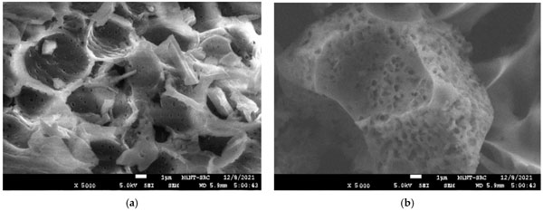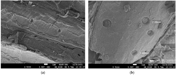 使用FESEM分析觀察了活性炭產(chǎn)品的浸漬和碳化溫度影響的形態(tài)變化。圖1a、b描繪了木質(zhì)素在被激活之前的表面形態(tài)。它顯示出厚而平坦的圖案,中間有小裂縫。這歸因于大量的木質(zhì)素,一種酚類聚合物,賦予植物結(jié)構(gòu)強度,使其具有堅硬粗糙的木材狀結(jié)構(gòu)。在圖1b中,發(fā)現(xiàn)前體具有壓實的表面,上面有淺而堵塞的孔隙圖案。這可能是由于烘箱干燥過程中預(yù)處理和加熱過程的反應(yīng)。從圖1a、b,由于無孔表面的存在,表面清楚地顯示為不令人滿意的吸附材料。