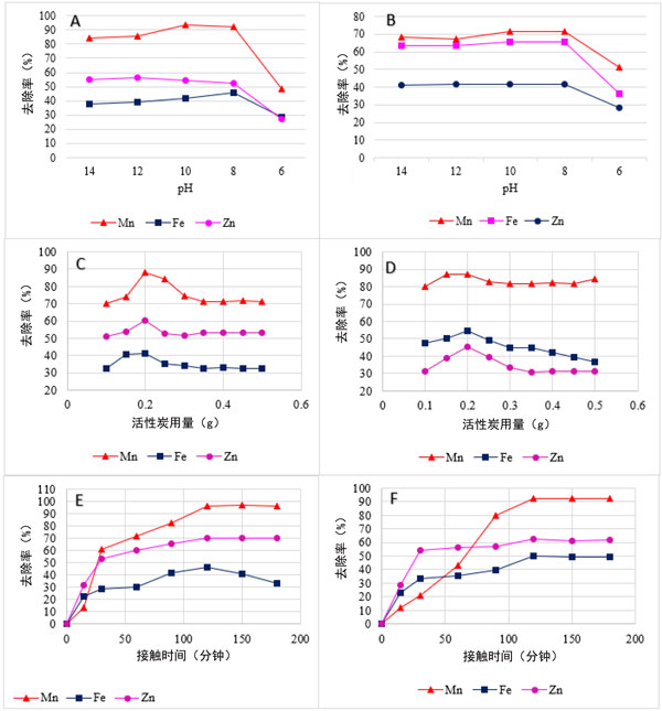 在分批吸附研究中,pH值是一個重要因素,它會通過改變所用吸附劑的表面電荷分布來影響吸附過程。在6和14的范圍內(nèi)觀察到木材加工廢水中重金屬(Mn、Fe和Zn)的pH相關(guān)影響。圖3A、B清楚地表明,當纖維板加工廢水中的Mn、Fe和Zn分別使用pH8時,兩種活性炭均獲得最佳結(jié)果。