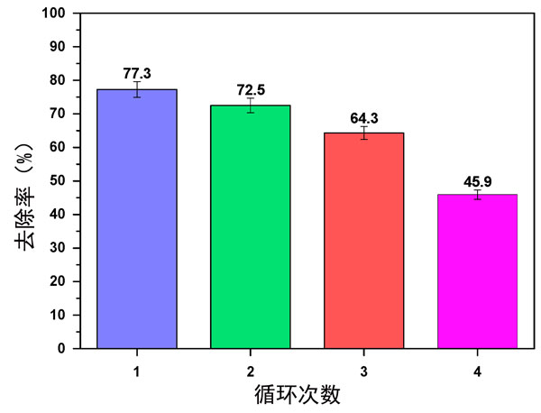 通過回收研究調(diào)查了改性活性炭的再利用以從廢水中去除活性黑5。進行實驗時,最初使用100mg/L活性黑5和0.8g/L的改性活性炭,pH值為2。在第一個循環(huán)之后,使用0.01M/NaOH溶液對所使用的改性活性炭顆粒進行處理大約2小時。此后,用蒸餾水沖洗顆粒以除去任何殘留的堿。選擇被認為可接受的重復時間,以便能夠在后續(xù)循環(huán)中重復使用吸附劑。研究結(jié)果如圖3所示。在用1M/NaOH處理成功再生后,解吸的改性活性炭能夠重復使用多達四個循環(huán)以去除活性黑5;钚院5的去除百分比在第一個循環(huán)中約為77.3%,在第四個循環(huán)后下降至約45.9%。總的來說,這項研究證明了將改性活性炭吸附劑重復使用四個循環(huán)以從廢水中去除活性黑5的潛力。