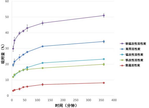復(fù)合鐵錳活性炭顯示出最高的吸附容量,6小時(shí)后的吸附量達(dá)到總吸附量的50.93±1.17%。這表明比標(biāo)準(zhǔn)活性炭和單金屬負(fù)載活性炭都有顯著改進(jìn)。鐵錳負(fù)載活性炭的二元系統(tǒng)協(xié)同工作,在吸附過(guò)程中利用了上述所有吸附機(jī)制,使得吸附容量比單金屬負(fù)載活性炭材料增加更多。
