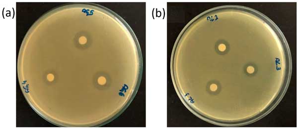 圖2:通過紙片擴(kuò)散對(a)水基大蒜提取物,16±1.3mm和(b)乙醇基大蒜提取物,14±1.0mm進(jìn)行抗菌敏感性測試(從10次重復(fù)獲得的平均值和標(biāo)準(zhǔn)偏差值)。