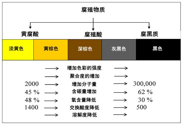 腐殖質(zhì)的性質(zhì)與其成分有非常密切的聯(lián)系,其成分受到腐殖化過(guò)程的影響,與分子(分子量)和顆粒的大小、分散程度(真溶液或膠體溶液)、極性(由這些決定)由骨架的性質(zhì)(芳香族;脂肪族)決定,主要是官能團(tuán)的類(lèi)型、數(shù)量和解離能力。腐殖質(zhì)成分的功能在于其在水中的溶解度(黃腐酸的溶解度比腐植酸高,因此天然水中平均含有87%的黃腐酸)、聚集能力、解離能力(主要是羧基)官能團(tuán))和相關(guān)的電荷比(粒子的zeta電位)。腐殖質(zhì)的一些特性也受到水的成分及其pH值的影響。圖1顯示了腐殖質(zhì)的基本特性。