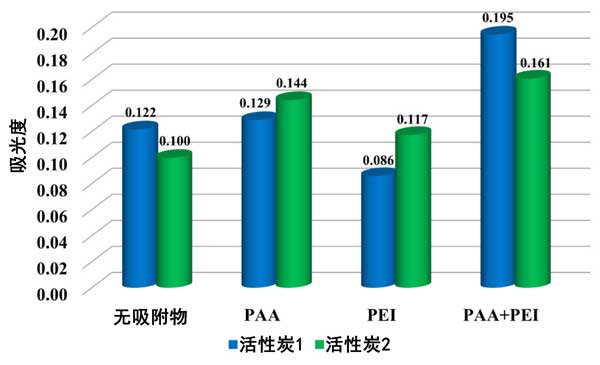 圖5:單一和二元吸附質(zhì)系統(tǒng)中活性炭1和活性炭2懸浮液在pH3時150分鐘后的吸光度。
