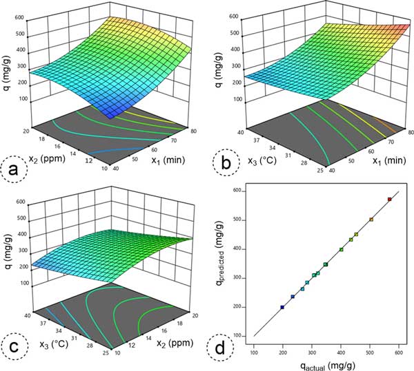 圖3:3D響應(yīng)曲面圖說(shuō)明了雙自變量的綜合影響(a)接觸持續(xù)時(shí)間與入口濃度(x1—x2)、(b)接觸持續(xù)時(shí)間與溫度(x1—x3)和(c)入口濃度與溫度(x2—x3)和(d)比較苯吸附的實(shí)際吸附容量(q)和預(yù)測(cè)吸附容量(q)的圖。